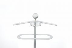 Clothes hanger of white painted metal. Wooden base with scratch-resistant finish available in white colour. CL 836 wood Clothes hanger of painted metal coated white. Base and details in natural wood.